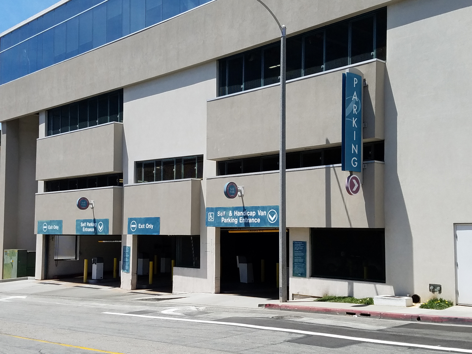 The six story parking garage has two entrances and two exits. One entrance for the lower levels (P4 - P2) and one for the upper levels (P4 - P6).