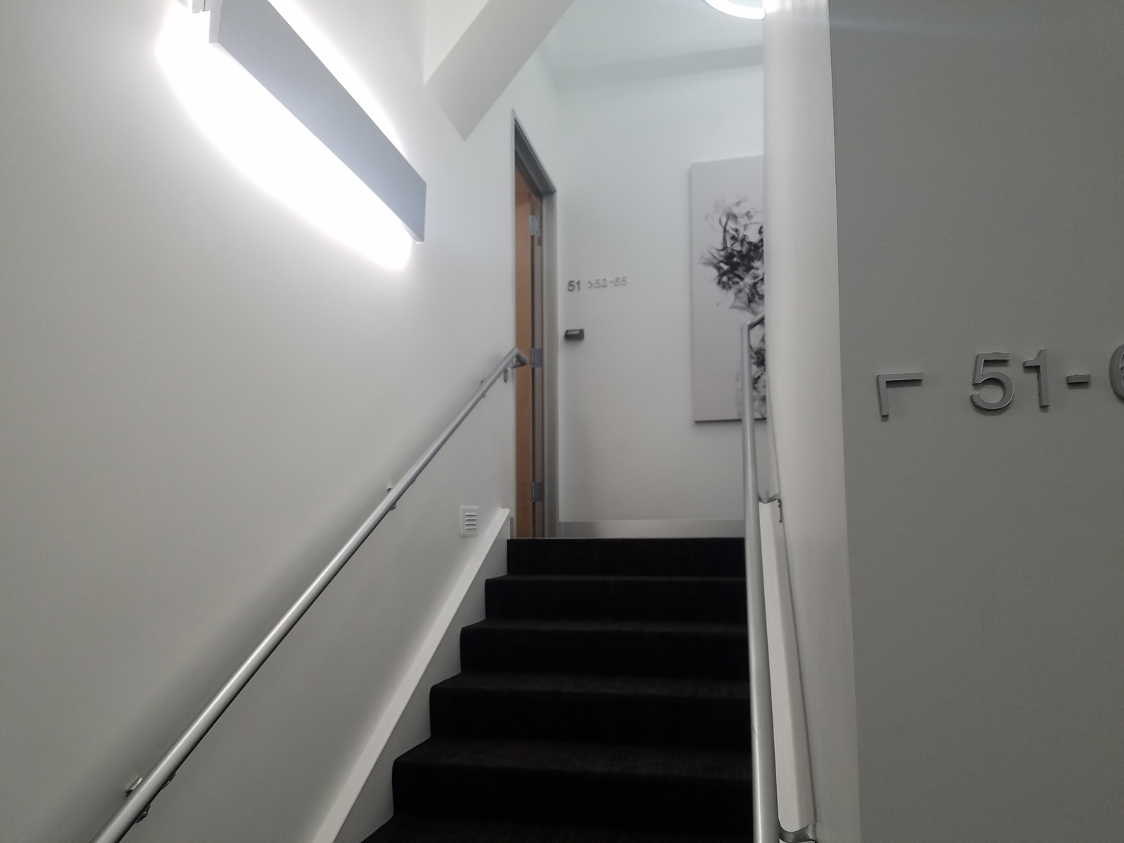 Walk left down the hallway past the front desk, pass the elevator mid-hallway and take the stairs on the left. You'll see our studio, number 51 on the landing on the left
